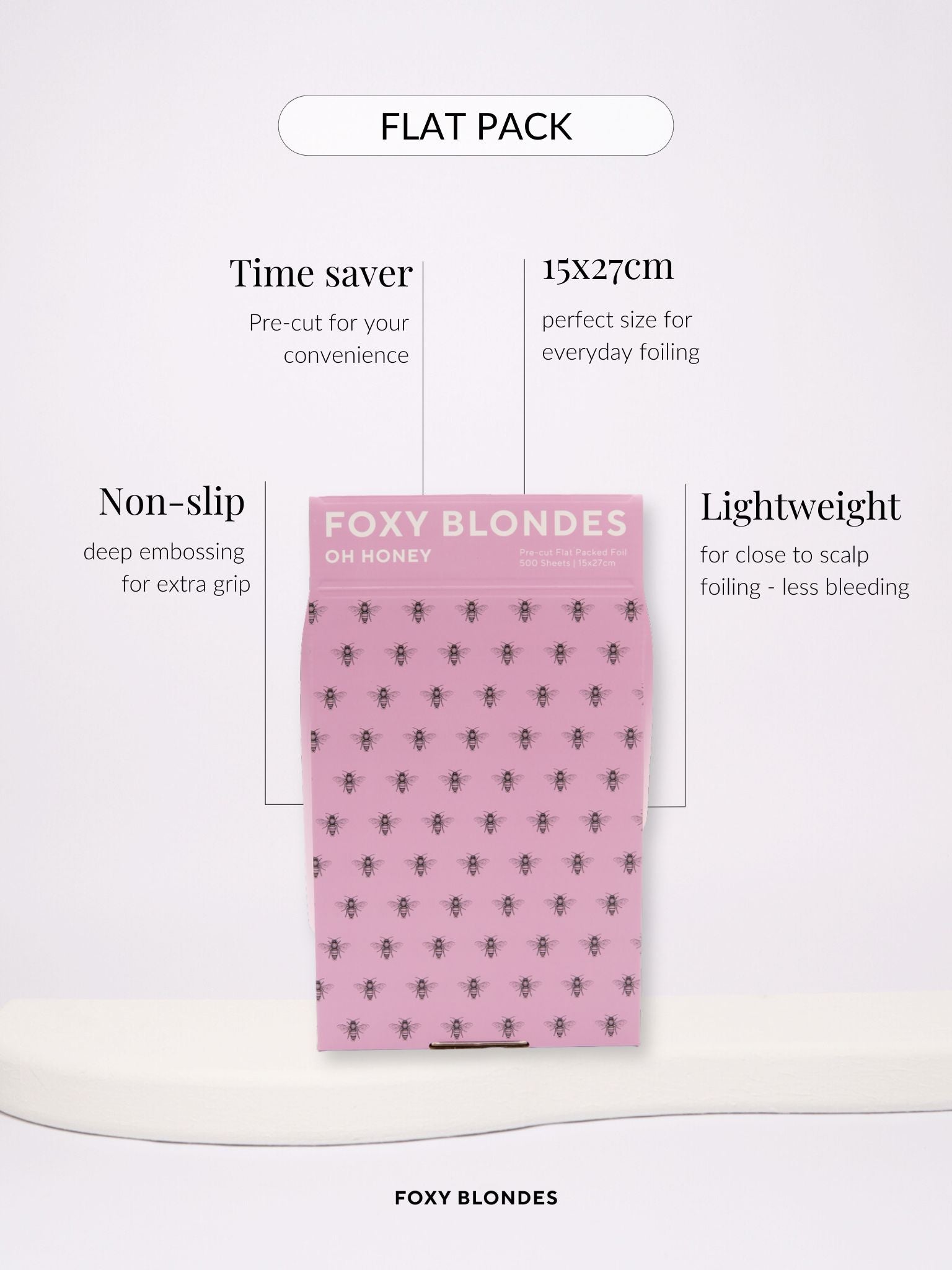 Bright, bold and beautifully practical  the FOXY BLONDES Oh Honey Flat Pack Foil is designed to deliver smooth, consistent colour results with a fun pop of personality. Perfect for blonding, highlighting, balayage and creative techniques, this salon-grade foil offers strength, slip and reliability so you can work quickly without tearing or sticking.