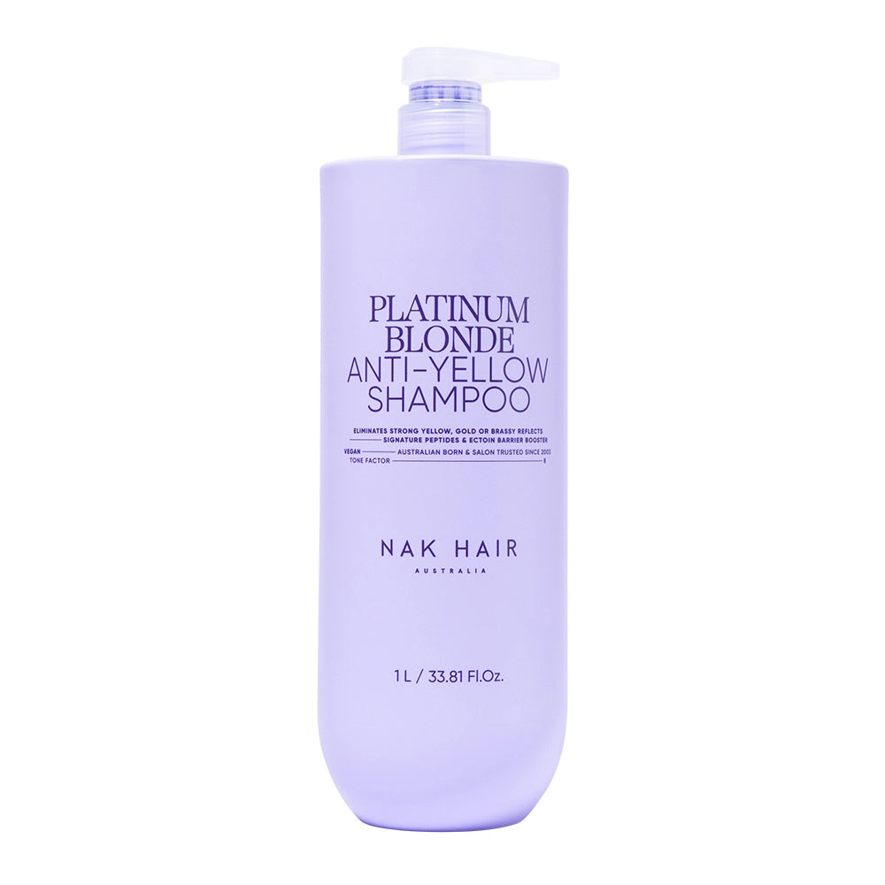 Designed for blonde, silver, and grey hair, NAK Signature Platinum Blonde Anti-Yellow Shampoo is a violet-based formula that neutralises brassiness and unwanted yellow tones while gently cleansing. Its nourishing blend enhances cool tones, adds brightness, and maintains colour clarity for radiant, salon-fresh results.